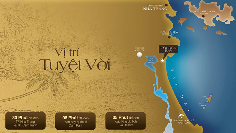 Golden Bay – Khu đô thị kiểu mẫu đầu tiên và duy nhất. tọa lạc tại Bắc Bán Đảo Cam Ranh, nơi được quy hoạch thành khu kinh tế – du lịch trọng điểm, mang tầm Quốc gia và Quốc tế của tỉnh Khánh Hòa. Nằm trên tuyến đường du lịch của 3 trung tâm lớn là Nha Trang, Ninh Chử ( Ninh Thuận) và Đà Lạt, không quá xa với các trung tâm du lịch lớn của Việt Nam như Tp Hồ Chí Minh, Vũng Tàu… Ngoài ra, có các nút giao thông đường thủy, đường bộ cũng như đường không thuận lợi, cộng thêm đường bờ biển dài, quang cảnh nên thơ đã tạo nên một dự án đất nền Golden Bay Cam Ranh thành một vùng đất vàng có giá trị to lớn hơn bao giờ hết.